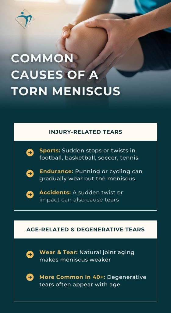 - Meniscus tears can happen from sports, injuries, or daily wear and tear.