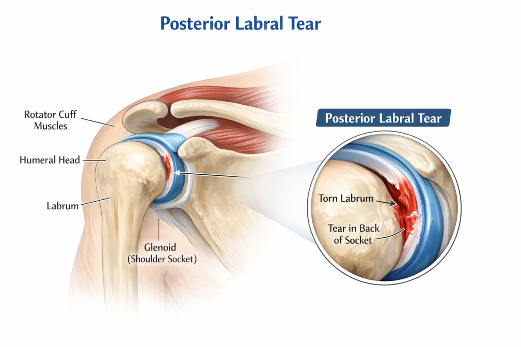 - Posterior labral tear occurs at the back of the shoulder socket, and is caused by trauma, repeated strain, or pressure on the shoulder.